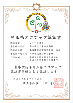 この度、島田建設工業株式会社は埼玉県より埼玉県エコアップ認証事業所として認証されました。