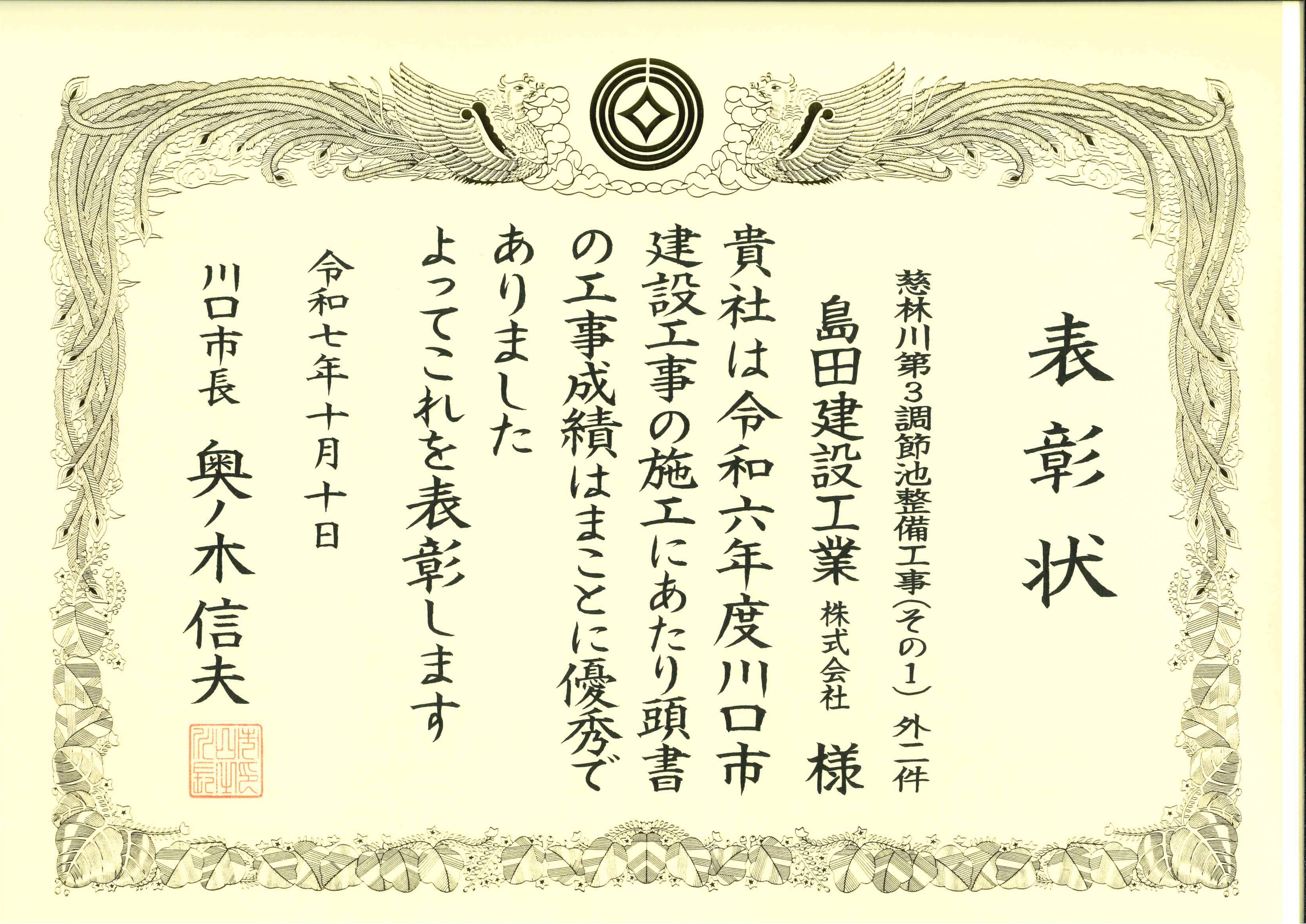 このたび弊社は、川口市長より「川口市優秀建設工事施工業者表彰」をいただきました。
