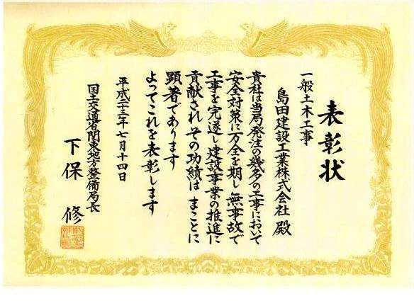 関東地方整備局長より「安全管理優良受注者」表彰をいただきました