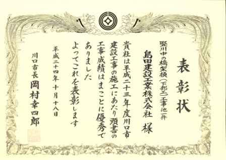 川口市長より優秀建設工事・5年連続表彰、建設業労働災害防止協会より優良賞の表彰をいただきました。