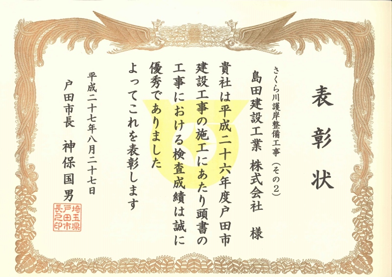 戸田市長より、優秀建設工事の表彰をいただきました。