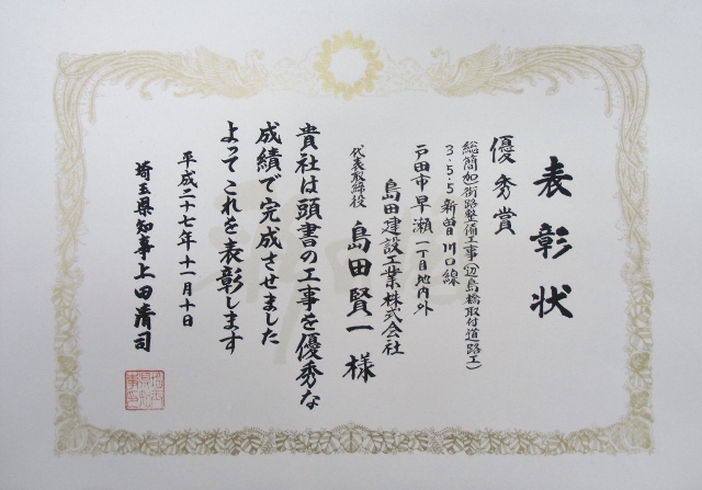 埼玉県知事より、優秀建設工事の表彰をいただきました。