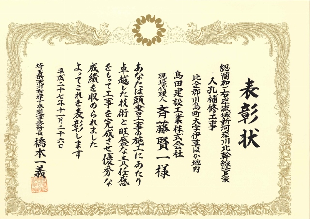 さいたま県土整備事務所長より、優秀建設工事の表彰をいただきました。