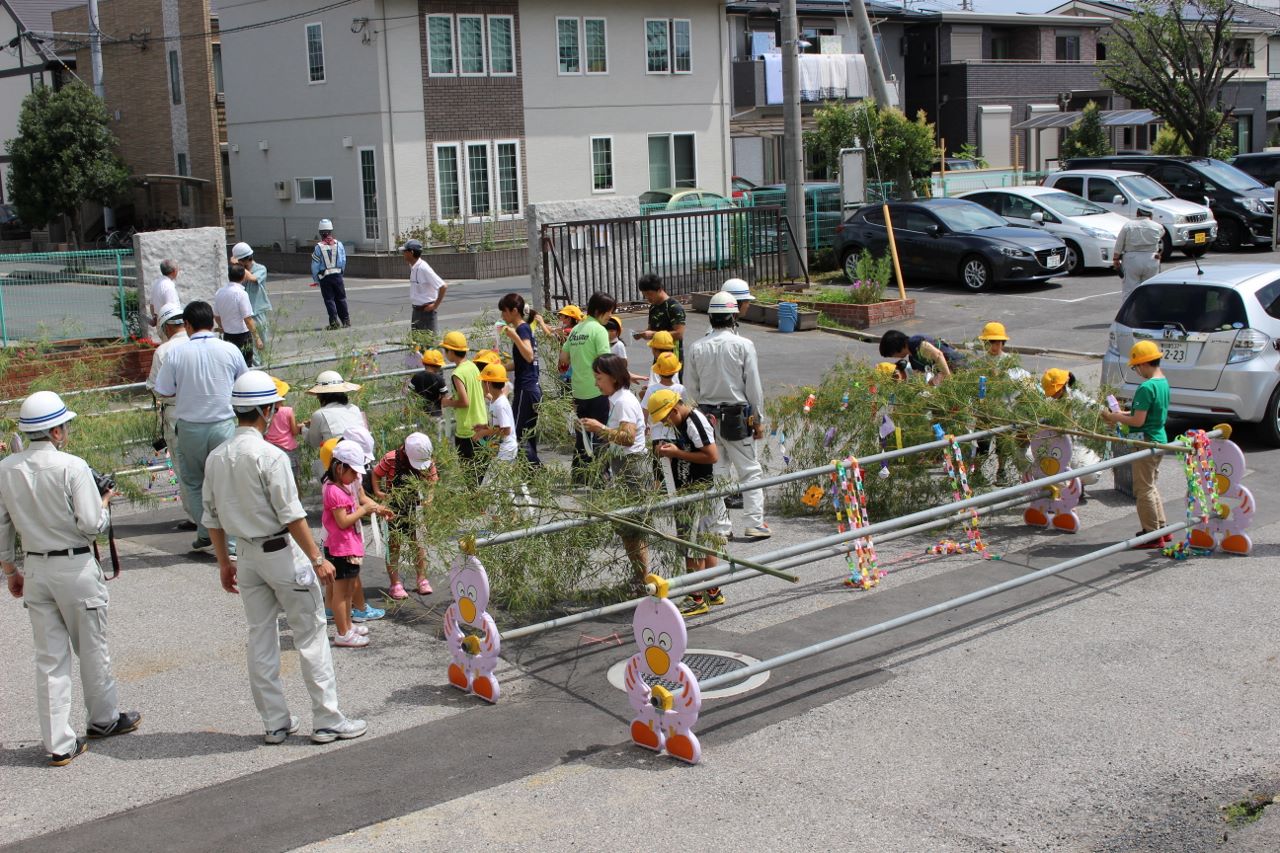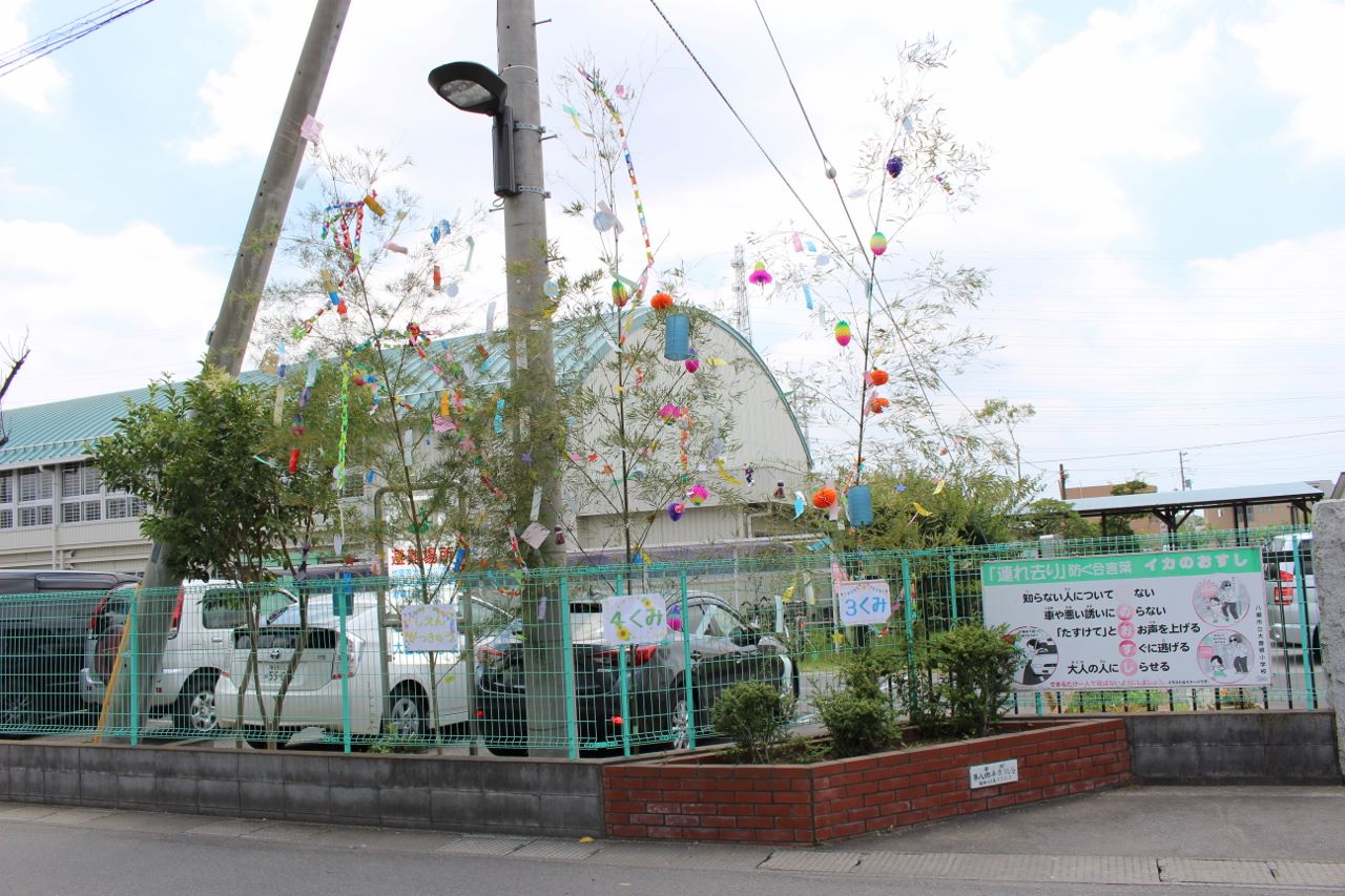 児童それぞれが思い思いに短冊を作成して暑い中、願い事が叶うように飾り付けをしました。