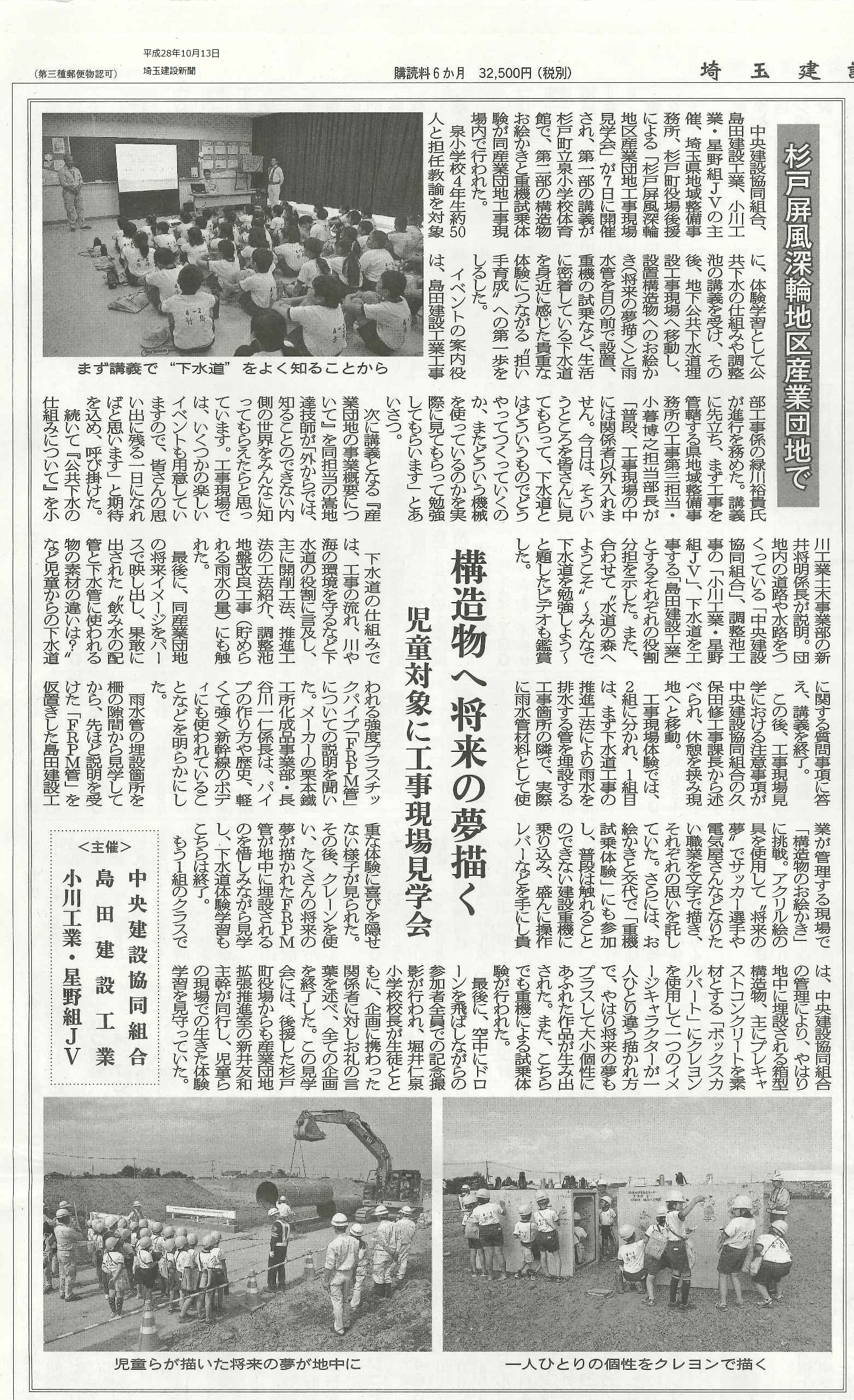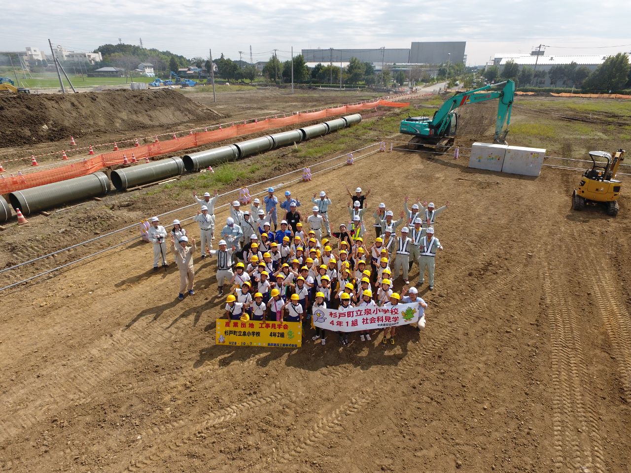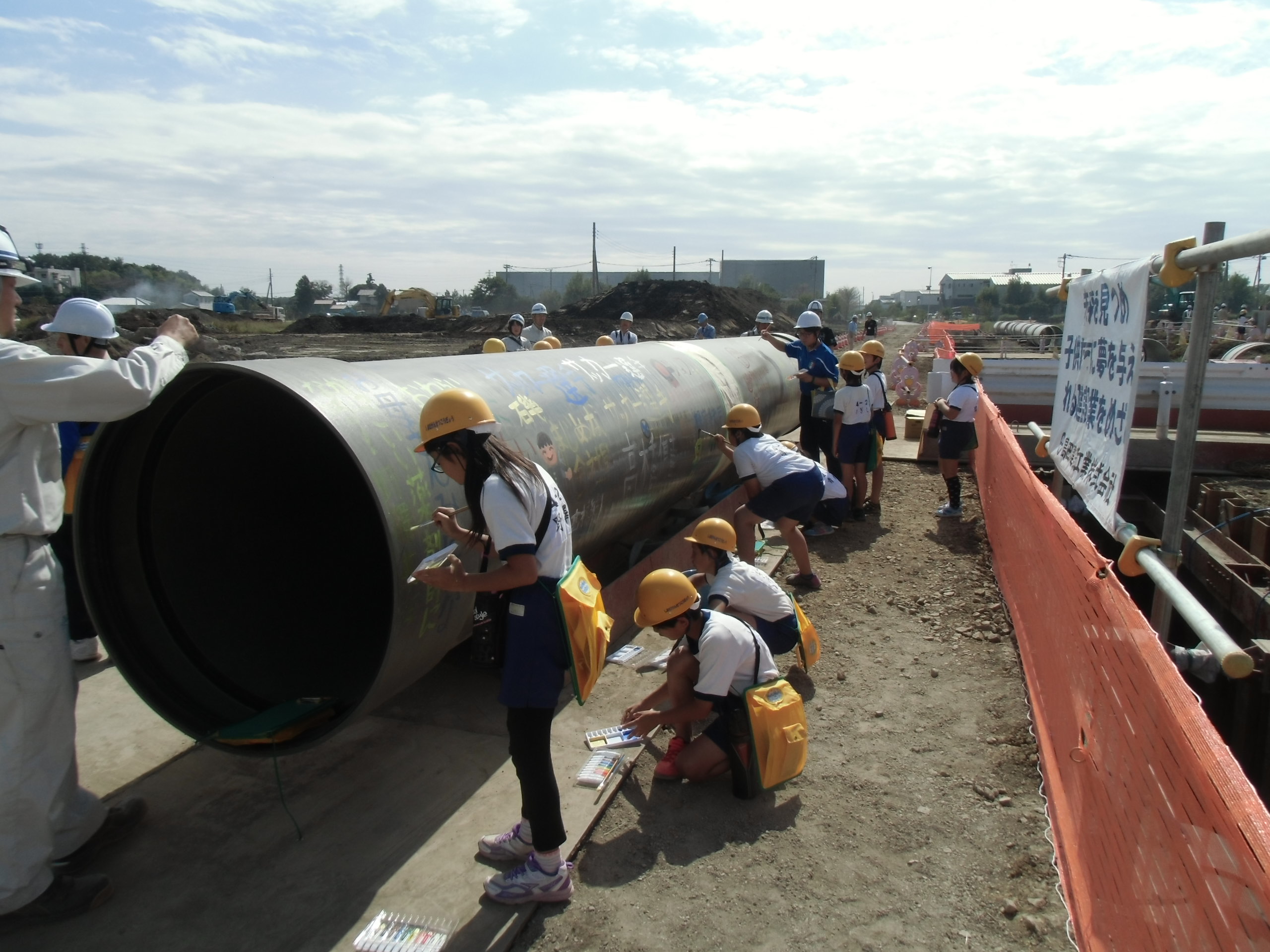 近隣の杉戸町立泉小学校4年生をお招きして開催しました。雨水管にお絵かきし、建設機械に乗り記念写真も撮りました。