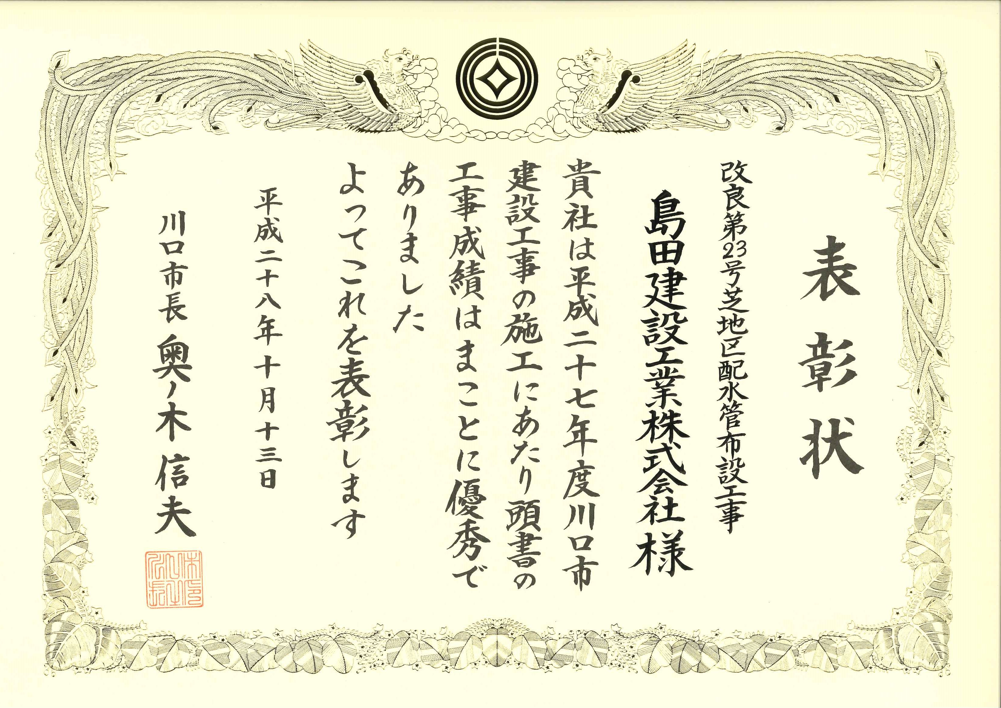 川口市長より、優秀建設工事の表彰をいただきました。