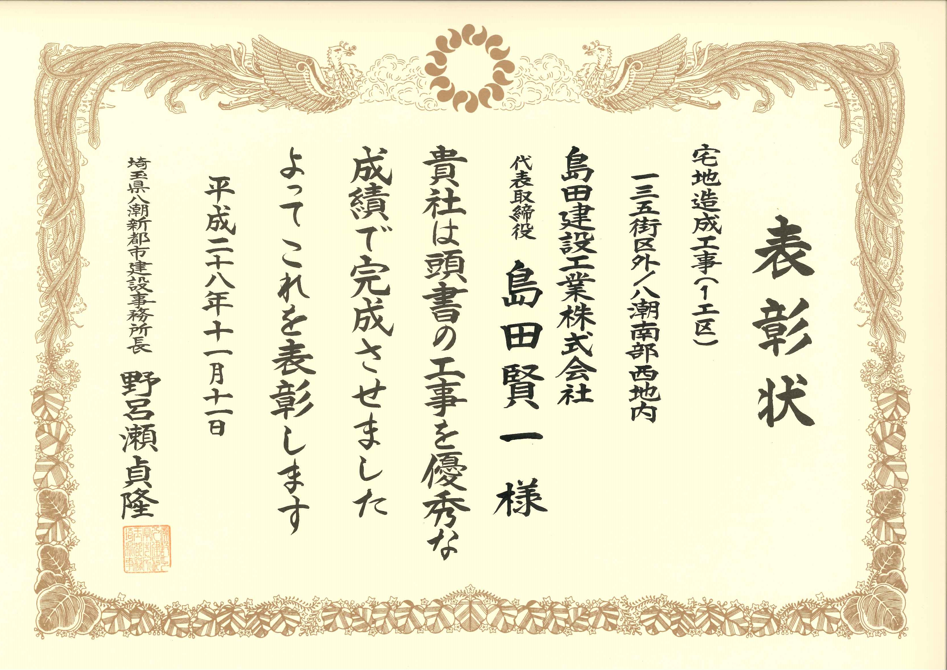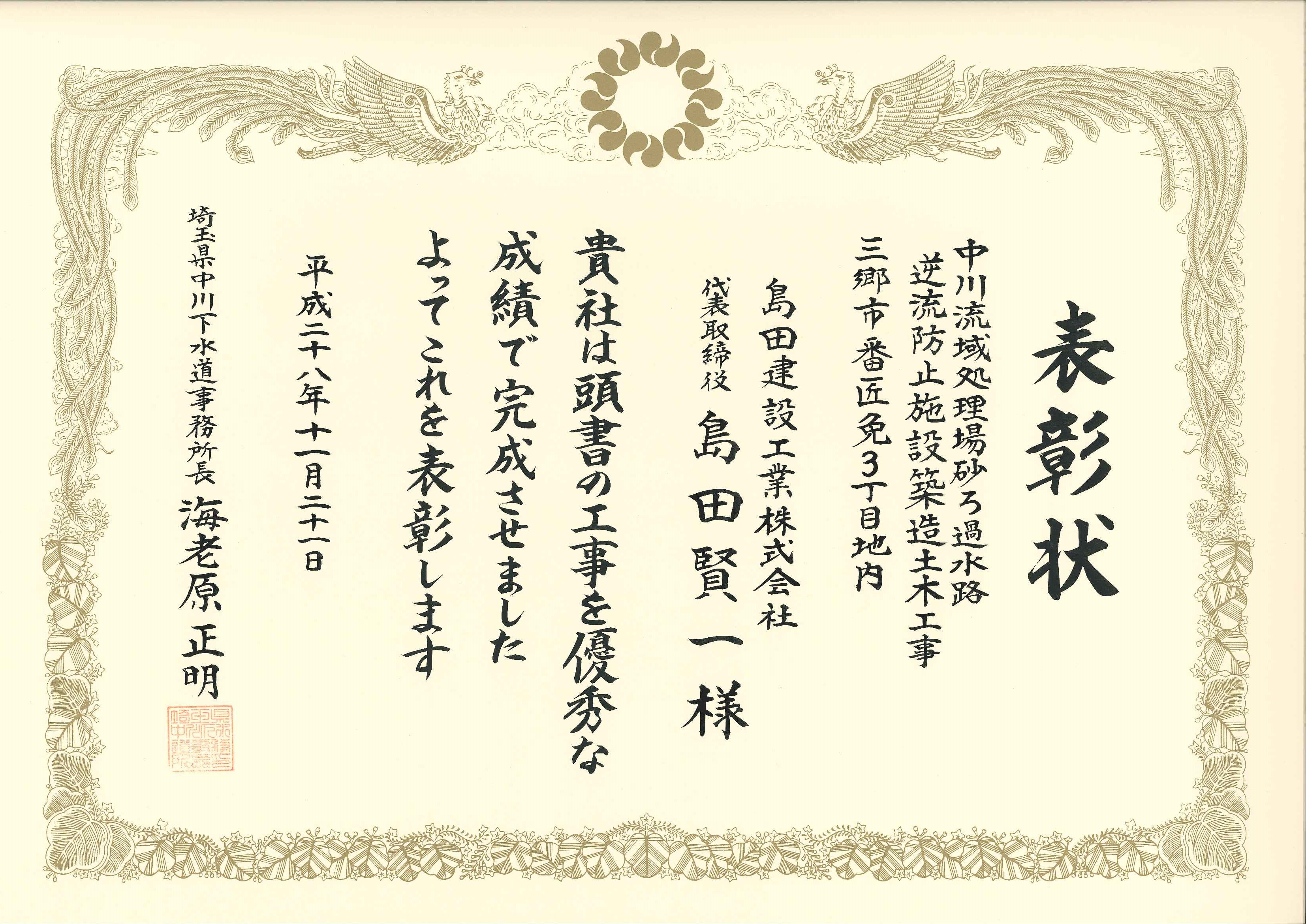 さいたま県土整備事務所、八潮新都市建設事務所、中川下水道事務所より優秀建設工事施工者表彰ならびに優秀現場代理人等表彰を計6本いただきました。