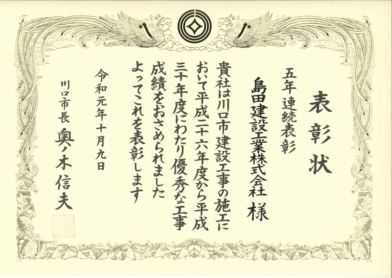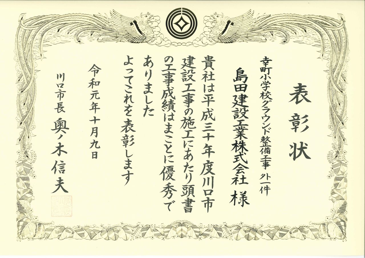 このたび、当社は川口市長より優秀工事表彰をいただきました。