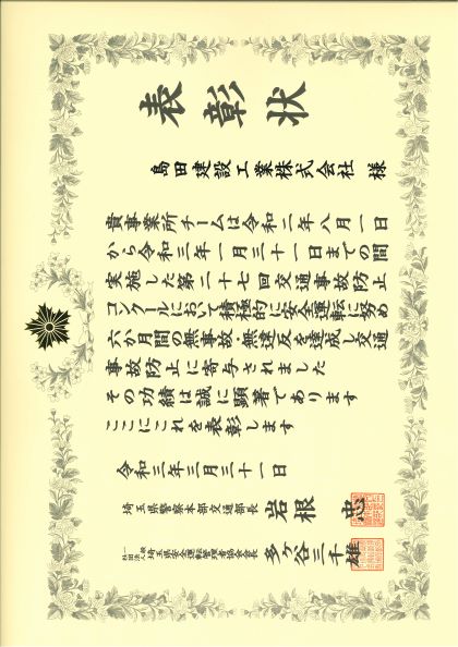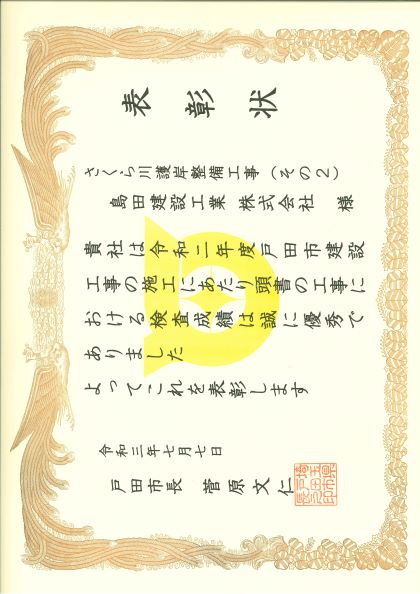このたび弊社は戸田市様より優秀工事施工業者表彰をいただきました。